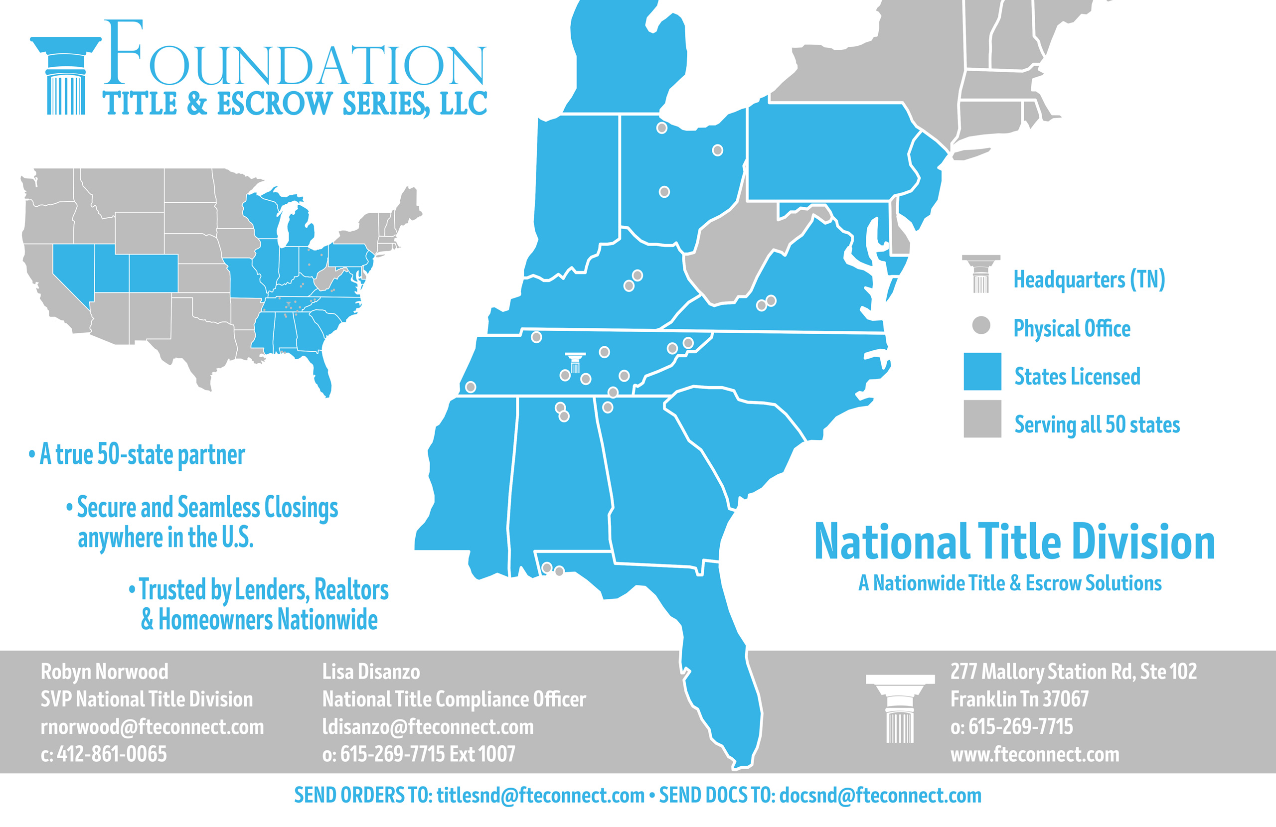 Foundation Title & Escrow Series, LLC is a title and settlement services company. We are not a law firm and do not provide legal advice, legal opinions, or legal representation. In jurisdictions where applicable laws or regulations require certain settlement or closing functions to be performed by a licensed attorney, we engage and coordinate with duly licensed attorneys to perform those functions in compliance with local legal requirements. Any information provided by Foundation Title & Escrow Series, LLC is for general informational purposes only and should not be construed as legal advice. You should consult with a licensed attorney regarding any legal questions or concerns related to your transaction.